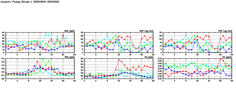 | Air Quality Data Time Series in Airport, Pump House 1 (2020/09/12) | ( Line colors: Day -3 Day -2 Day -1 Current day ) | 2D Map Current AQHI |