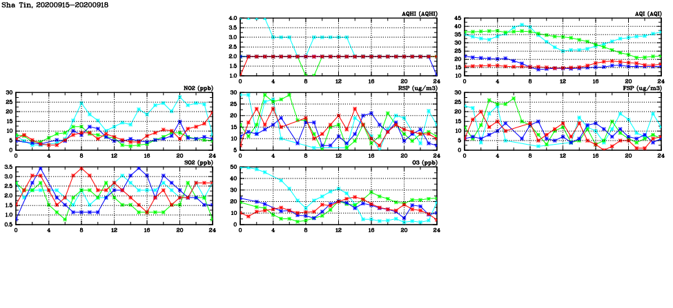 | Air Quality Data Time Series in Sha Tin (2020/09/18) | ( Line colors: Day -3 Day -2 Day -1 Current day ) | 2D Map Current AQHI |