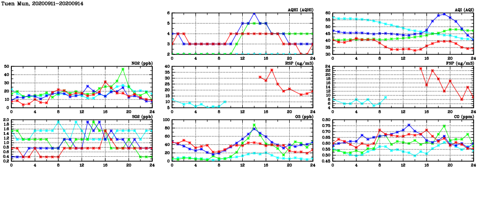 | Air Quality Data Time Series in Tuen Mun (2020/09/14) | ( Line colors: Day -3 Day -2 Day -1 Current day ) | 2D Map Current AQHI |