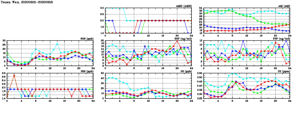 | Air Quality Data Time Series in Tsuen Wan (2020/09/18) | ( Line colors: Day -3 Day -2 Day -1 Current day ) | 2D Map Current AQHI |