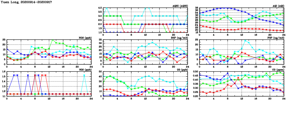 | Air Quality Data Time Series in Yuen Long (2020/09/17) | ( Line colors: Day -3 Day -2 Day -1 Current day ) | 2D Map Current AQHI |