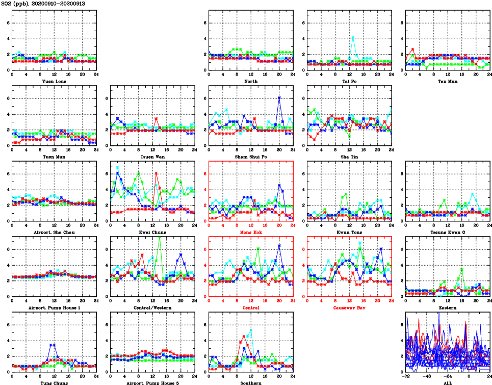 | Air Quality Data Time Series for SO2 (2020/09/13) | ( Line colors: Day -3 Day -2 Day -1 Current day ) | 2D Map Current AQHI |