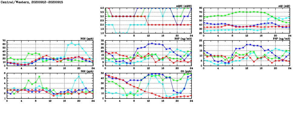 | Air Quality Data Time Series in Central/Western (2020/09/15) | ( Line colors: Day -3 Day -2 Day -1 Current day ) | 2D Map Current AQHI |