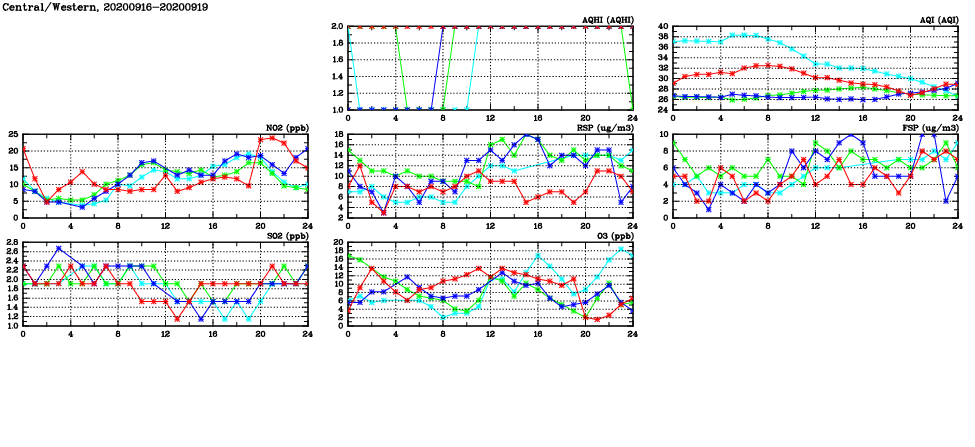 | Air Quality Data Time Series in Central/Western (2020/09/19) | ( Line colors: Day -3 Day -2 Day -1 Current day ) | 2D Map Current AQHI |