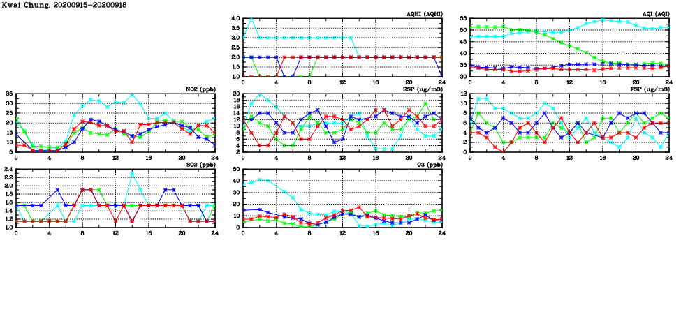 | Air Quality Data Time Series in Kwai Chung (2020/09/18) | ( Line colors: Day -3 Day -2 Day -1 Current day ) | 2D Map Current AQHI |