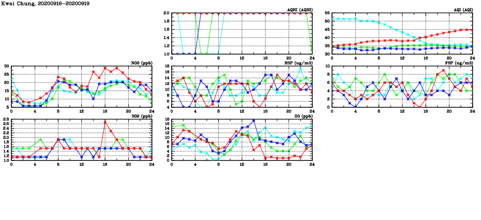 | Air Quality Data Time Series in Kwai Chung (2020/09/19) | ( Line colors: Day -3 Day -2 Day -1 Current day ) | 2D Map Current AQHI |