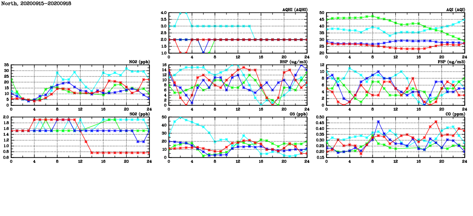 | Air Quality Data Time Series in North (2020/09/18) | ( Line colors: Day -3 Day -2 Day -1 Current day ) | 2D Map Current AQHI |