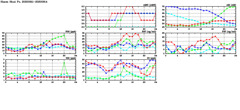 | Air Quality Data Time Series in Sham Shui Po (2020/09/14) | ( Line colors: Day -3 Day -2 Day -1 Current day ) | 2D Map Current AQHI |