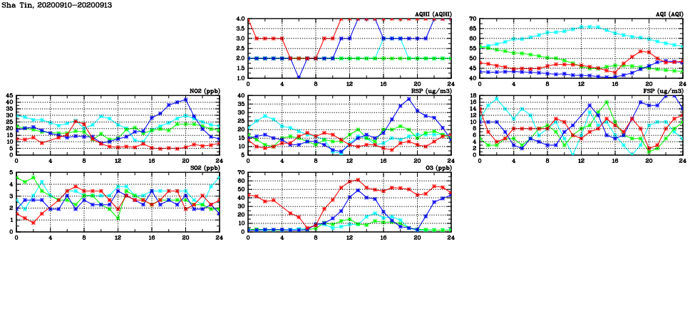 | Air Quality Data Time Series in Sha Tin (2020/09/13) | ( Line colors: Day -3 Day -2 Day -1 Current day ) | 2D Map Current AQHI |