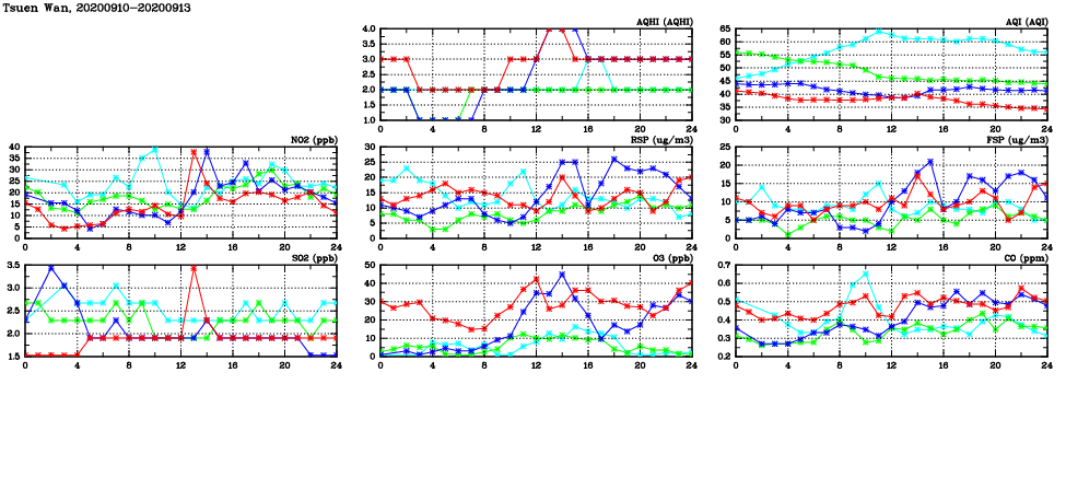 | Air Quality Data Time Series in Tsuen Wan (2020/09/13) | ( Line colors: Day -3 Day -2 Day -1 Current day ) | 2D Map Current AQHI |