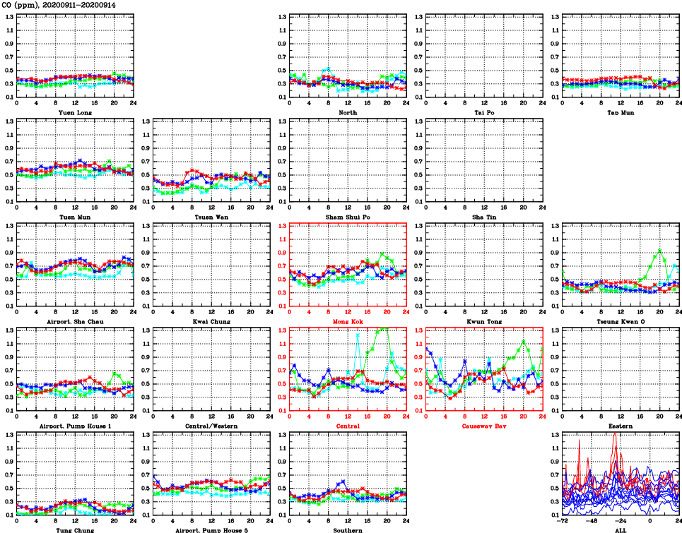 | Air Quality Data Time Series for CO (2020/09/14) | ( Line colors: Day -3 Day -2 Day -1 Current day ) | 2D Map Current AQHI |