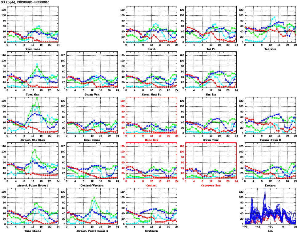 | Air Quality Data Time Series for O3 (2020/09/15) | ( Line colors: Day -3 Day -2 Day -1 Current day ) | 2D Map Current AQHI |