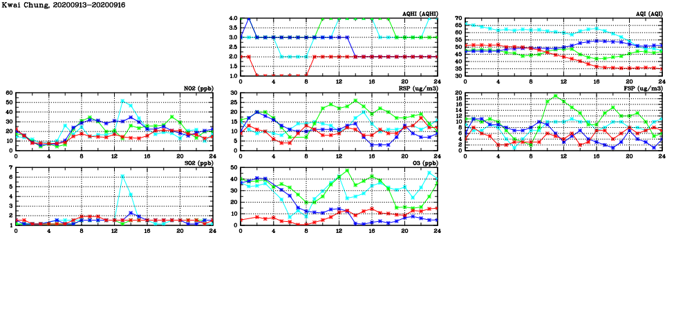 | Air Quality Data Time Series in Kwai Chung (2020/09/16) | ( Line colors: Day -3 Day -2 Day -1 Current day ) | 2D Map Current AQHI |