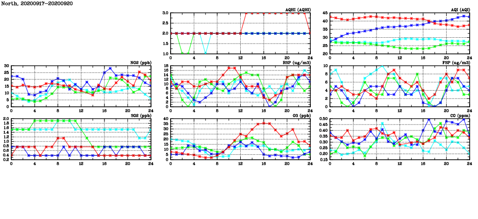 | Air Quality Data Time Series in North (2020/09/20) | ( Line colors: Day -3 Day -2 Day -1 Current day ) | 2D Map Current AQHI |
