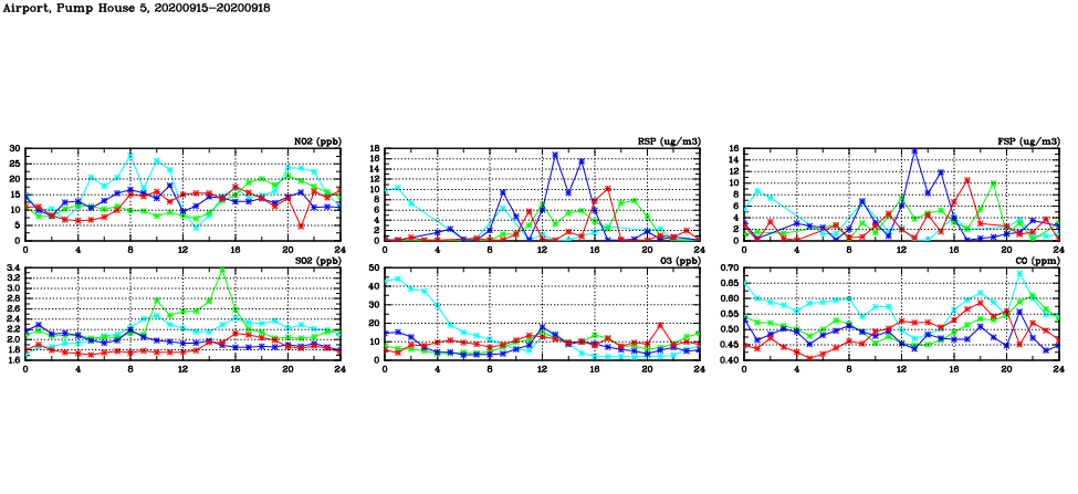 | Air Quality Data Time Series in Airport, Pump House 5 (2020/09/18) | ( Line colors: Day -3 Day -2 Day -1 Current day ) | 2D Map Current AQHI |