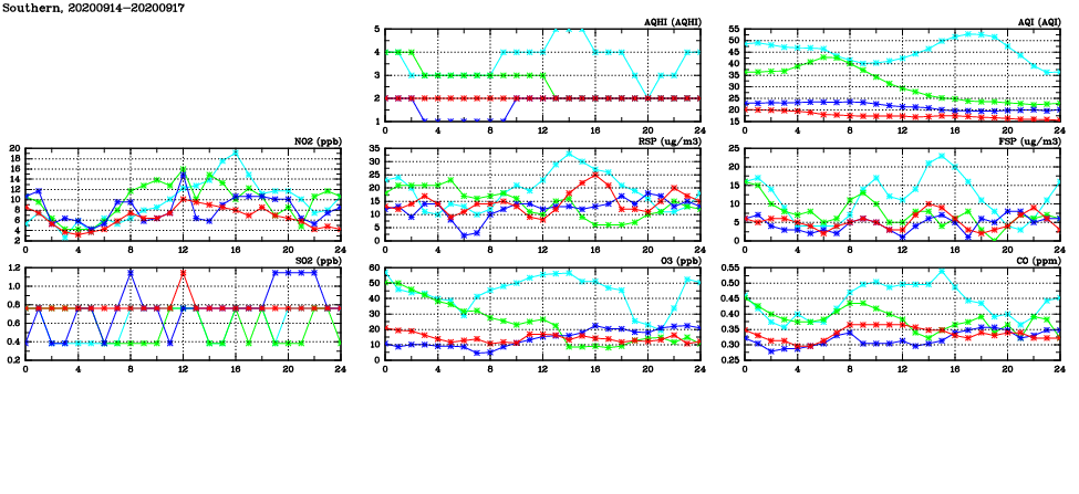 | Air Quality Data Time Series in Southern (2020/09/17) | ( Line colors: Day -3 Day -2 Day -1 Current day ) | 2D Map Current AQHI |