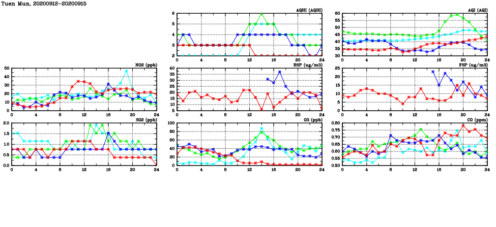 | Air Quality Data Time Series in Tuen Mun (2020/09/15) | ( Line colors: Day -3 Day -2 Day -1 Current day ) | 2D Map Current AQHI |