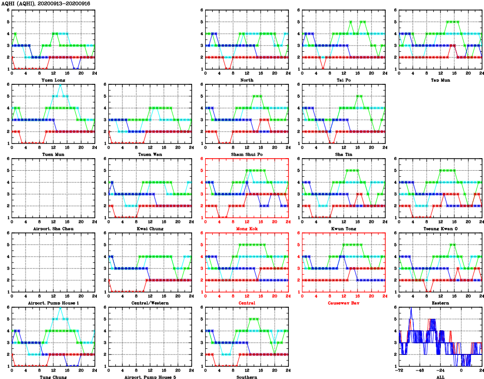 | Air Quality Data Time Series for AQHI (2020/09/16) | ( Line colors: Day -3 Day -2 Day -1 Current day ) | 2D Map Current AQHI |