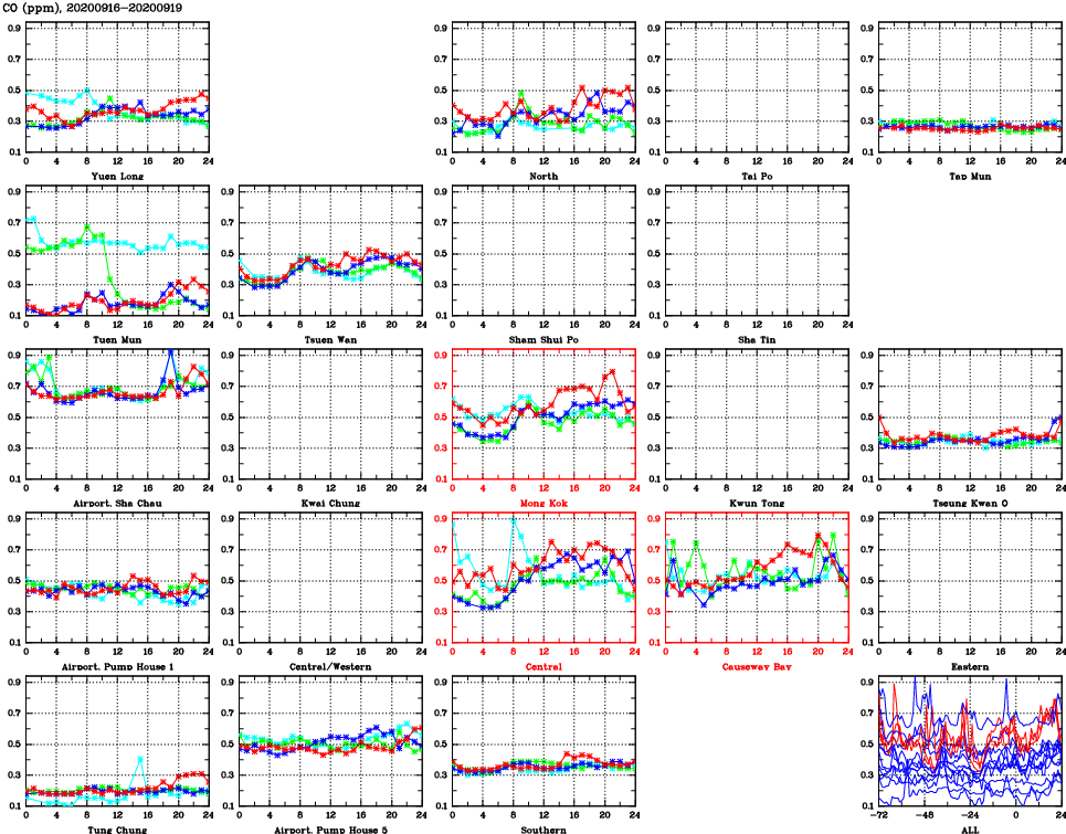 | Air Quality Data Time Series for CO (2020/09/19) | ( Line colors: Day -3 Day -2 Day -1 Current day ) | 2D Map Current AQHI |