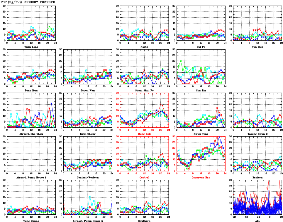 | Air Quality Data Time Series for FSP (2020/09/20) | ( Line colors: Day -3 Day -2 Day -1 Current day ) | 2D Map Current AQHI |