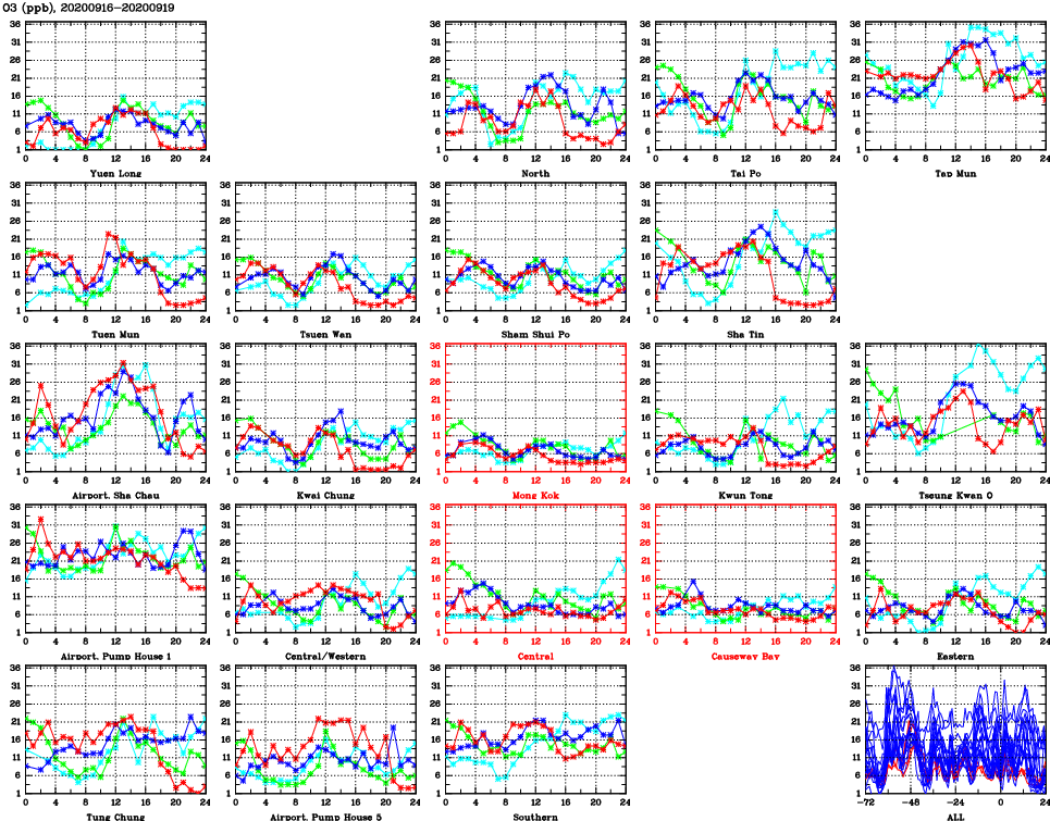 | Air Quality Data Time Series for O3 (2020/09/19) | ( Line colors: Day -3 Day -2 Day -1 Current day ) | 2D Map Current AQHI |
