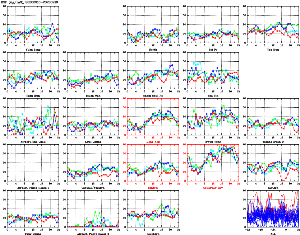 | Air Quality Data Time Series for RSP (2020/09/19) | ( Line colors: Day -3 Day -2 Day -1 Current day ) | 2D Map Current AQHI |