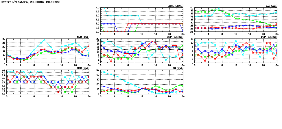 | Air Quality Data Time Series in Central/Western (2020/09/18) | ( Line colors: Day -3 Day -2 Day -1 Current day ) | 2D Map Current AQHI |