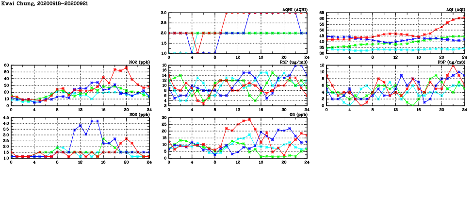 | Air Quality Data Time Series in Kwai Chung (2020/09/21) | ( Line colors: Day -3 Day -2 Day -1 Current day ) | 2D Map Current AQHI |