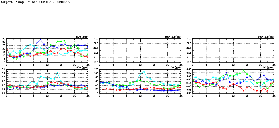 | Air Quality Data Time Series in Airport, Pump House 1 (2020/09/16) | ( Line colors: Day -3 Day -2 Day -1 Current day ) | 2D Map Current AQHI |