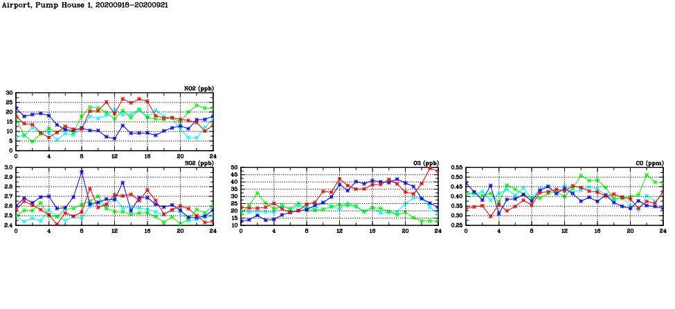 | Air Quality Data Time Series in Airport, Pump House 1 (2020/09/21) | ( Line colors: Day -3 Day -2 Day -1 Current day ) | 2D Map Current AQHI |