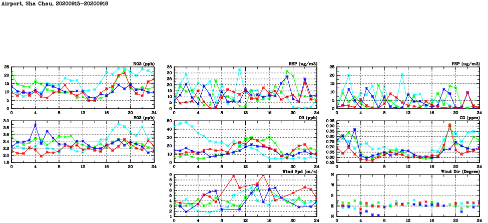 | Air Quality Data Time Series in Airport, Sha Chau (2020/09/18) | ( Line colors: Day -3 Day -2 Day -1 Current day ) | 2D Map Current AQHI |