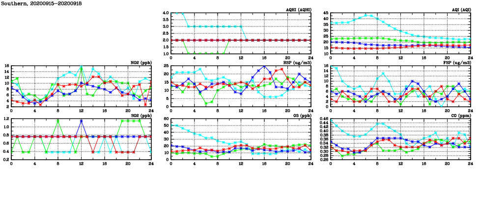 | Air Quality Data Time Series in Southern (2020/09/18) | ( Line colors: Day -3 Day -2 Day -1 Current day ) | 2D Map Current AQHI |