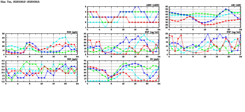 | Air Quality Data Time Series in Sha Tin (2020/09/15) | ( Line colors: Day -3 Day -2 Day -1 Current day ) | 2D Map Current AQHI |