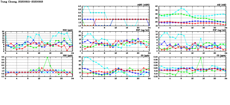 | Air Quality Data Time Series in Tung Chung (2020/09/18) | ( Line colors: Day -3 Day -2 Day -1 Current day ) | 2D Map Current AQHI |