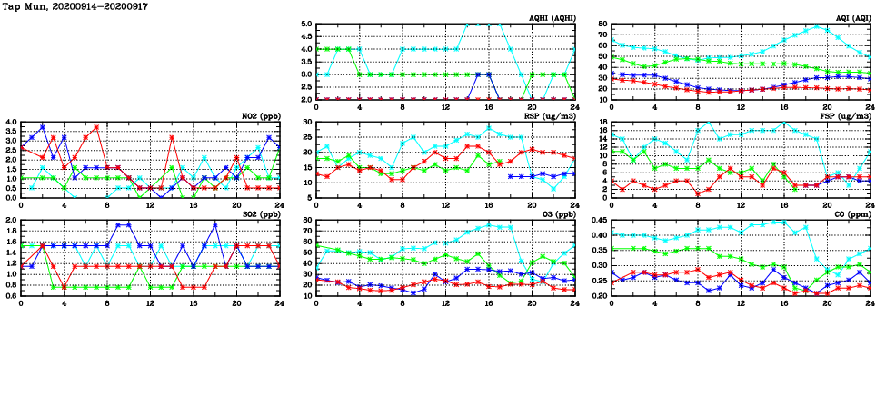 | Air Quality Data Time Series in Tap Mun (2020/09/17) | ( Line colors: Day -3 Day -2 Day -1 Current day ) | 2D Map Current AQHI |