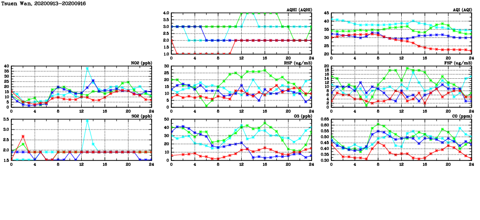 | Air Quality Data Time Series in Tsuen Wan (2020/09/16) | ( Line colors: Day -3 Day -2 Day -1 Current day ) | 2D Map Current AQHI |