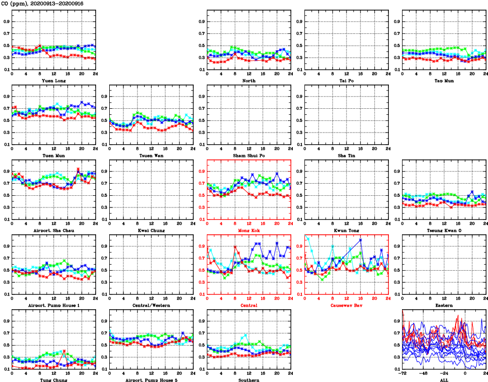 | Air Quality Data Time Series for CO (2020/09/16) | ( Line colors: Day -3 Day -2 Day -1 Current day ) | 2D Map Current AQHI |