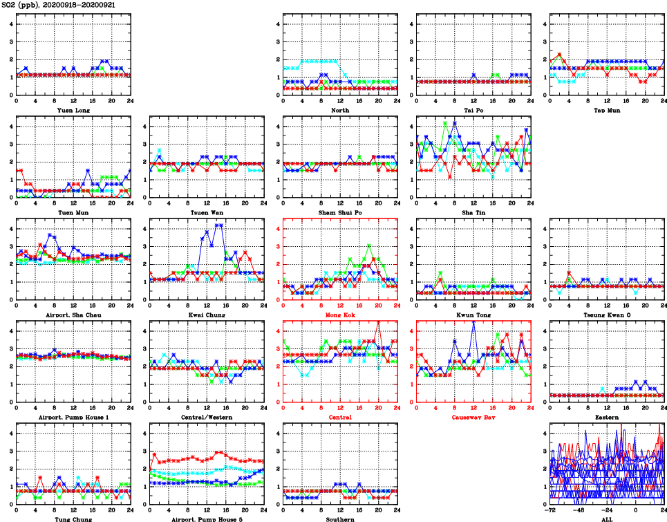 | Air Quality Data Time Series for SO2 (2020/09/21) | ( Line colors: Day -3 Day -2 Day -1 Current day ) | 2D Map Current AQHI |