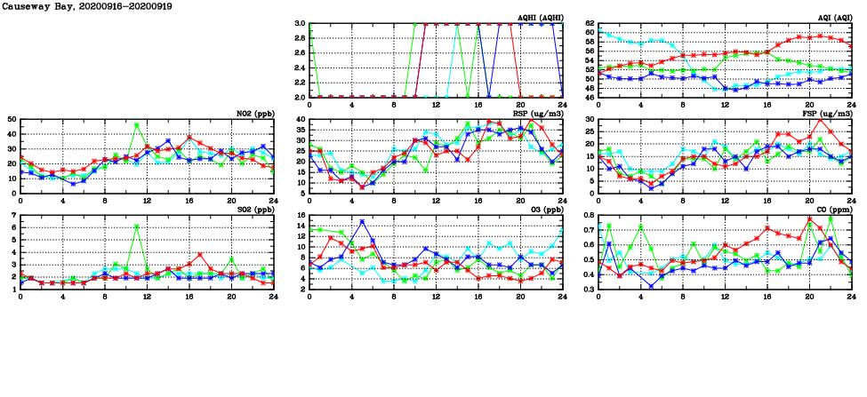 | Air Quality Data Time Series in Causeway Bay (2020/09/19) | ( Line colors: Day -3 Day -2 Day -1 Current day ) | 2D Map Current AQHI |