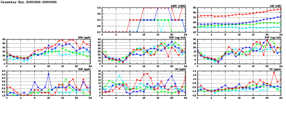 | Air Quality Data Time Series in Causeway Bay (2020/09/21) | ( Line colors: Day -3 Day -2 Day -1 Current day ) | 2D Map Current AQHI |