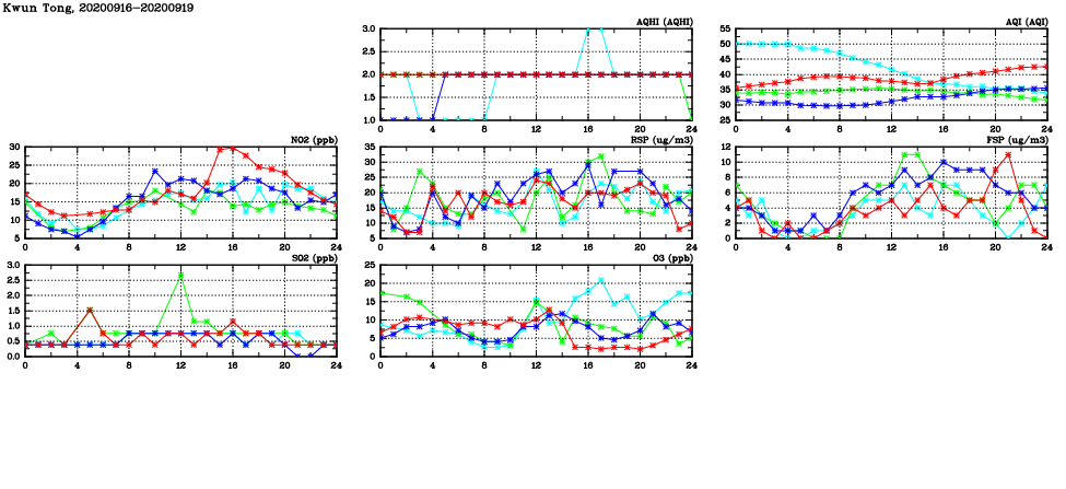 | Air Quality Data Time Series in Kwun Tong (2020/09/19) | ( Line colors: Day -3 Day -2 Day -1 Current day ) | 2D Map Current AQHI |