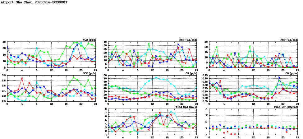 | Air Quality Data Time Series in Airport, Sha Chau (2020/09/17) | ( Line colors: Day -3 Day -2 Day -1 Current day ) | 2D Map Current AQHI |