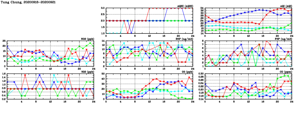 | Air Quality Data Time Series in Tung Chung (2020/09/21) | ( Line colors: Day -3 Day -2 Day -1 Current day ) | 2D Map Current AQHI |
