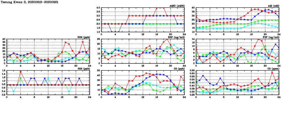 | Air Quality Data Time Series in Tseung Kwan O (2020/09/21) | ( Line colors: Day -3 Day -2 Day -1 Current day ) | 2D Map Current AQHI |