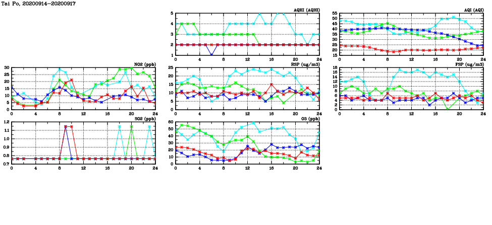 | Air Quality Data Time Series in Tai Po (2020/09/17) | ( Line colors: Day -3 Day -2 Day -1 Current day ) | 2D Map Current AQHI |