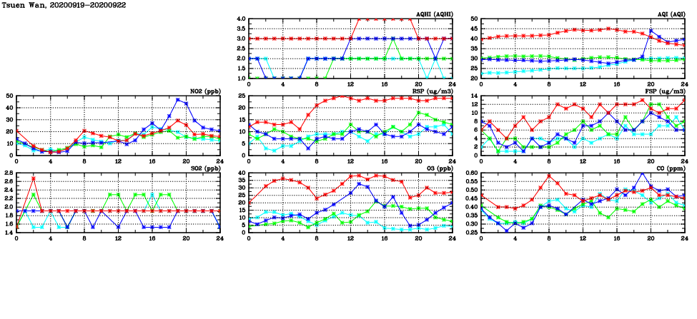 | Air Quality Data Time Series in Tsuen Wan (2020/09/22) | ( Line colors: Day -3 Day -2 Day -1 Current day ) | 2D Map Current AQHI |