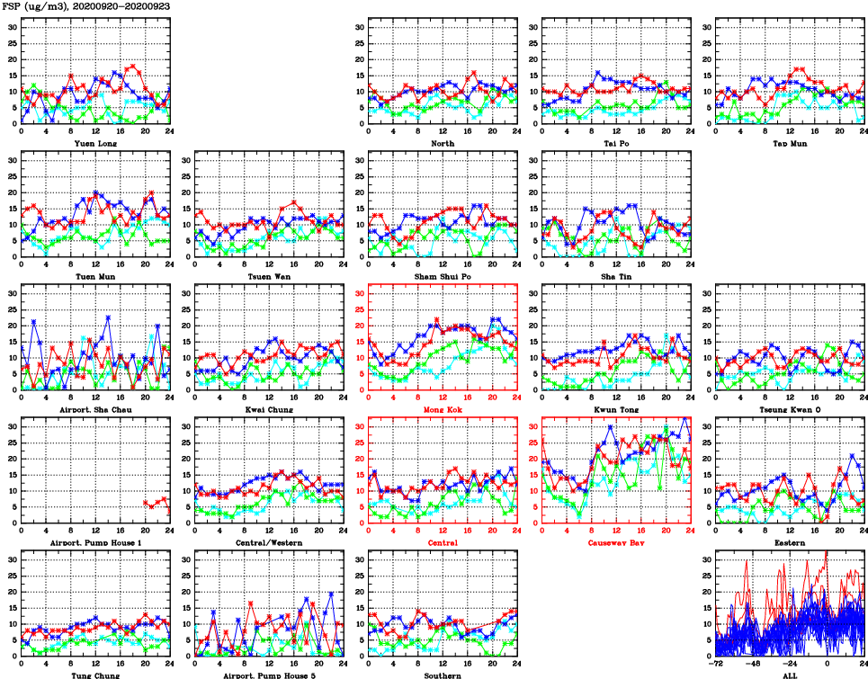 | Air Quality Data Time Series for FSP (2020/09/23) | ( Line colors: Day -3 Day -2 Day -1 Current day ) | 2D Map Current AQHI |