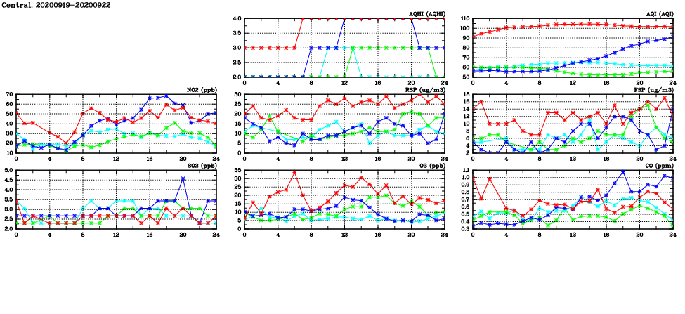 | Air Quality Data Time Series in Central (2020/09/22) | ( Line colors: Day -3 Day -2 Day -1 Current day ) | 2D Map Current AQHI |