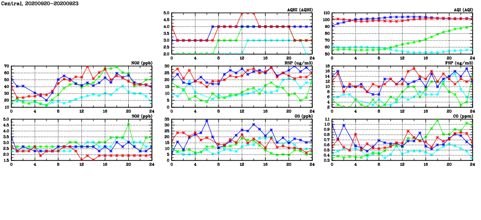 | Air Quality Data Time Series in Central (2020/09/23) | ( Line colors: Day -3 Day -2 Day -1 Current day ) | 2D Map Current AQHI |