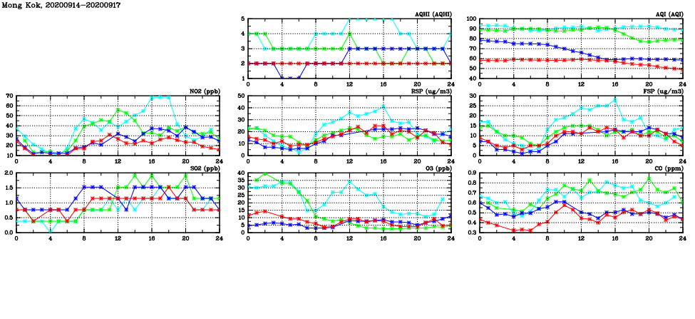 | Air Quality Data Time Series in Mong Kok (2020/09/17) | ( Line colors: Day -3 Day -2 Day -1 Current day ) | 2D Map Current AQHI |